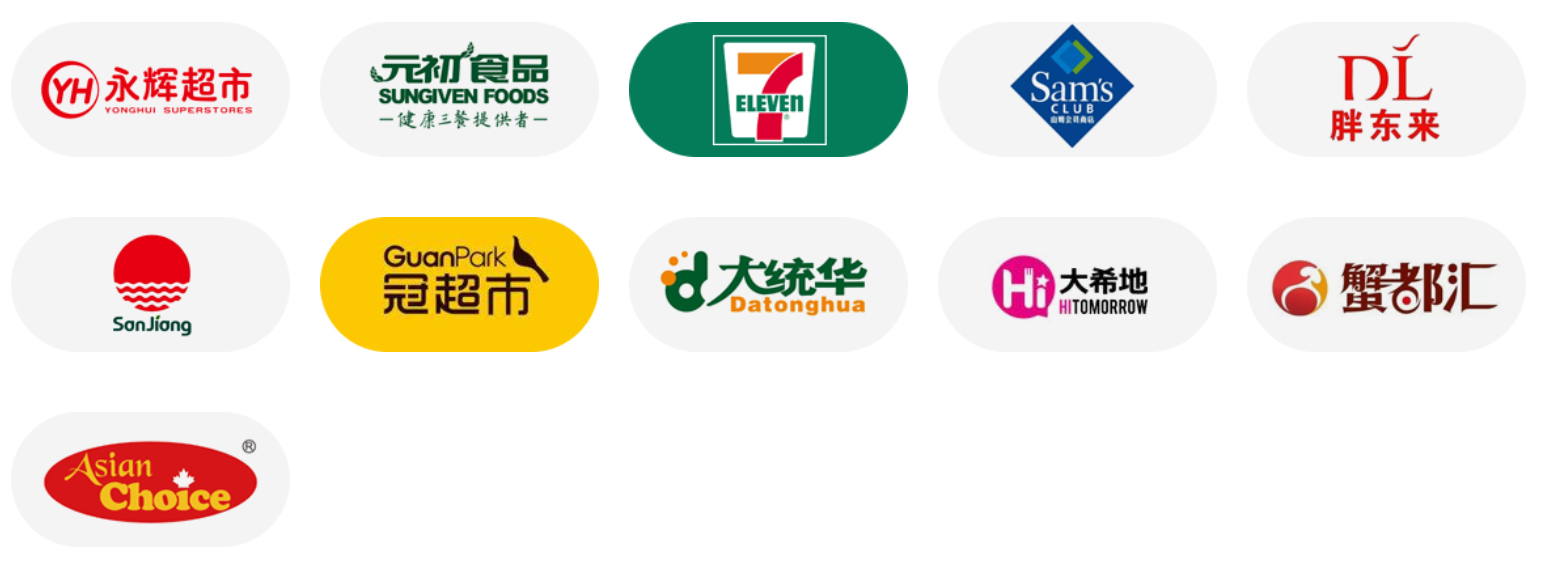 零售客戶:永輝超市、元初食品、7-11便利店、山姆大叔、胖東來(lái)、三江購(gòu)物、冠超市、大統(tǒng)華、大希地、蟹都匯、Asian Choice